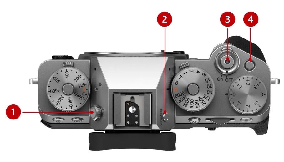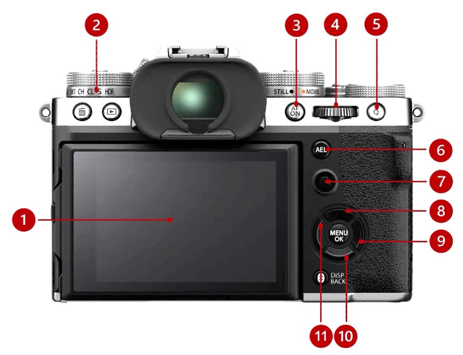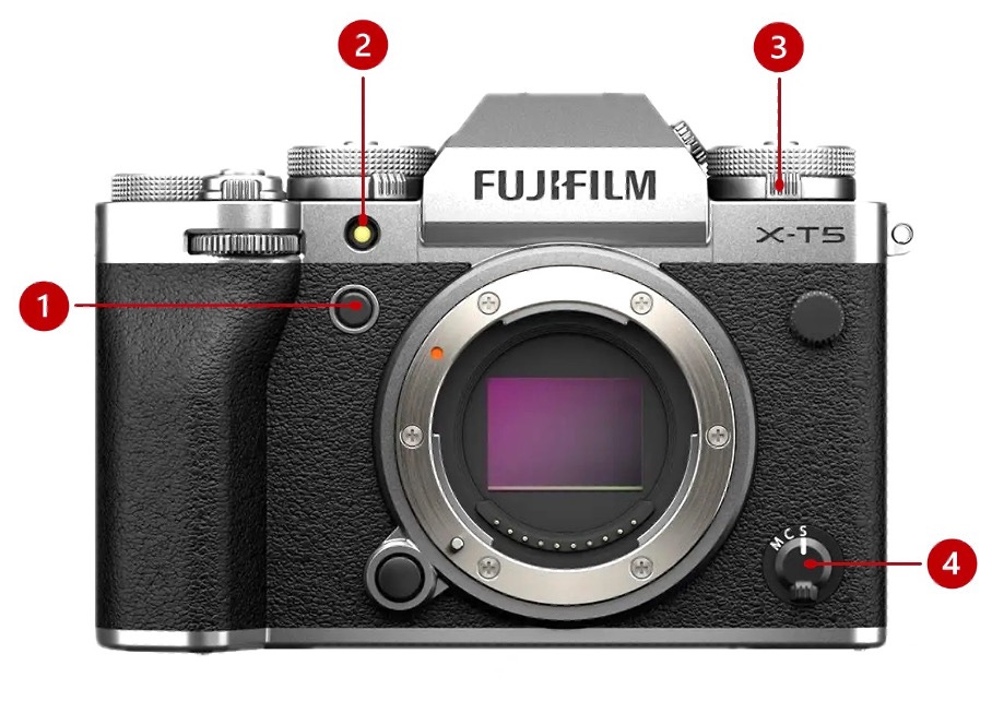 Here’s an overview of the location of all buttons, dials, and touch screen to focus on the Fujifilm X-T5 — across the front, rear, and top of the camera body.